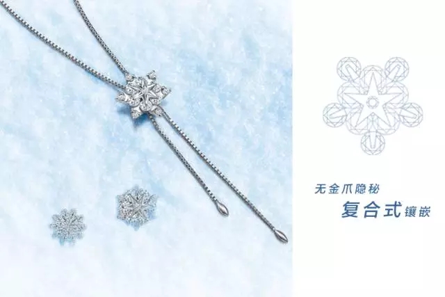 雪花鑲工藝采用隱秘復合式鑲嵌,沒有固定金爪,采用凹槽和支撐桿使鉆石拼合而成。整個花頭由于珠寶的拼合顯得體積較大,且會讓人忽略掉連接件的存在。從花頭上方看,顯鉆效果明顯,并且鉆石火彩熠熠,璀璨迷人。能達到更優的珠寶展示效果,外形像一朵隨風飄揚的雪花,唯美浪漫,美麗優雅。